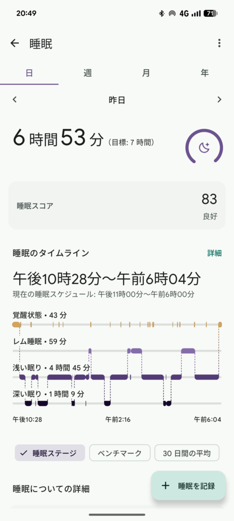 睡眠記録:睡眠スコアと、その根拠となる睡眠ステージ(深い眠り、レム睡眠など)を記録している