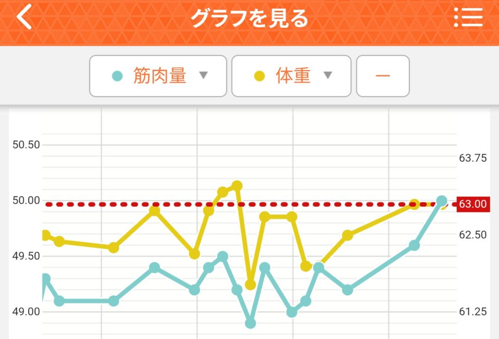 グラフの青色は僕の筋肉量の1か月間の変化なんだけど、1カ月前から筋トレを始めた成果でようやく最近になって、筋肉量が増加していることが分かる。自分の体の中身を知ることで「もっと運動しよう」と思えるようになり、運動の習慣が続くんだ。