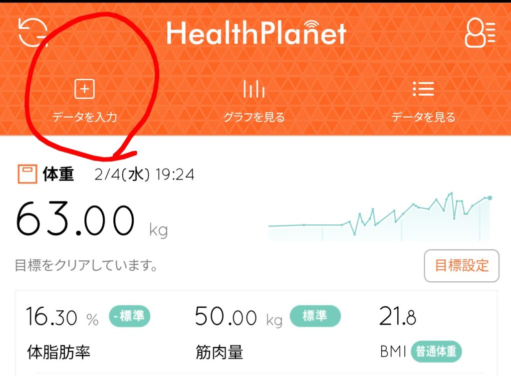 使い方はとても簡単、アプリをインストールしたら、自分の生年月日・身長などをアプリ記録しておく。bluetoothで体組成計本体と接続する。あとは、アプリ左上の「データを入力」ボタンをタップして体組成計に乗るだけだ。