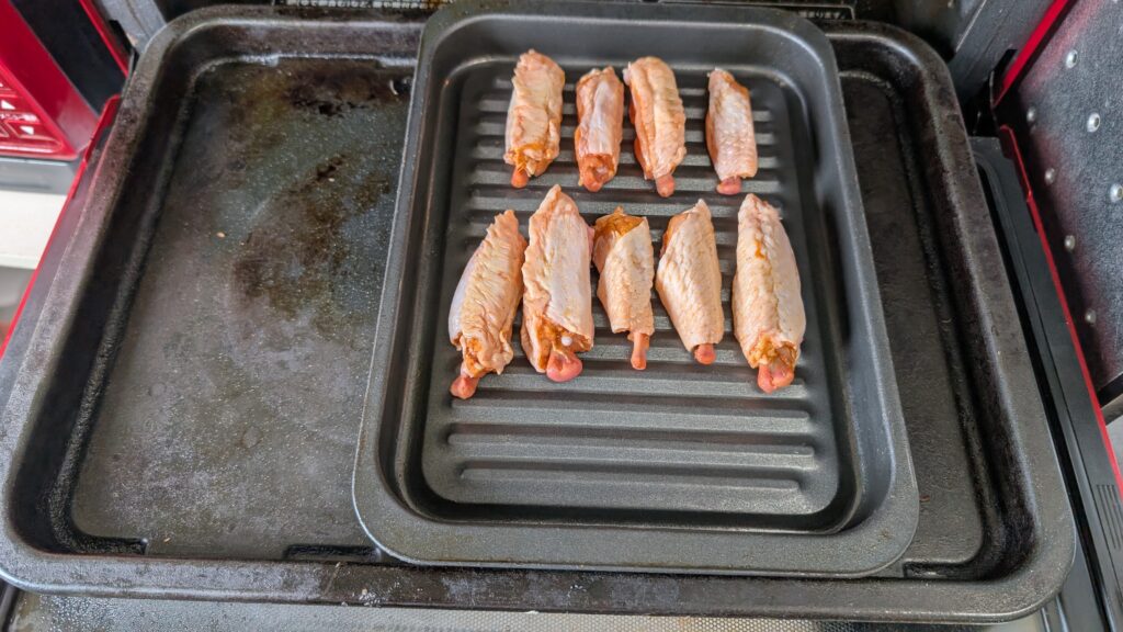 片方のオーブン機能でスーパーで買った味付け済の鶏肉を焼く!