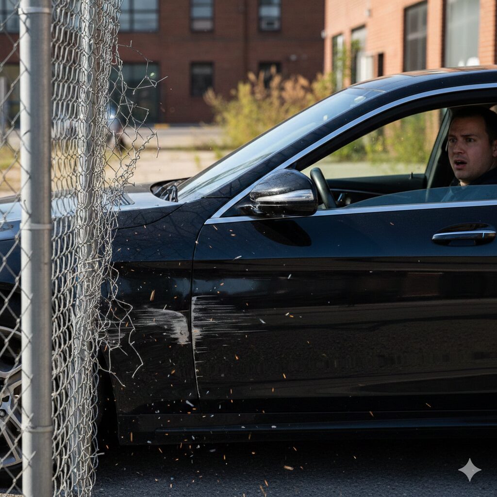 運転して右側にある場所に入るところだった。右に注意を向けすぎて左側の確認がおろそかになってしまい、左側にある金網フェンスに寄りすぎていることに気付かなかった。