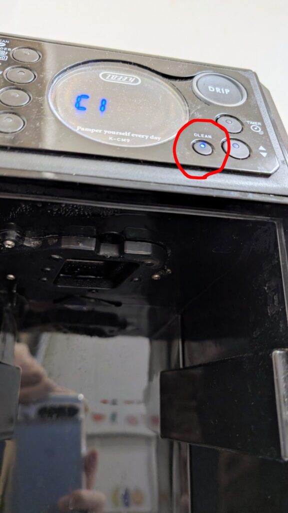 その後、クリーニングボタン(写真の赤丸)を押してC3を選択し、ミル(豆挽き)の空運転をし、コーヒー粉がちゃんと落ちてくることを確認し解決した。